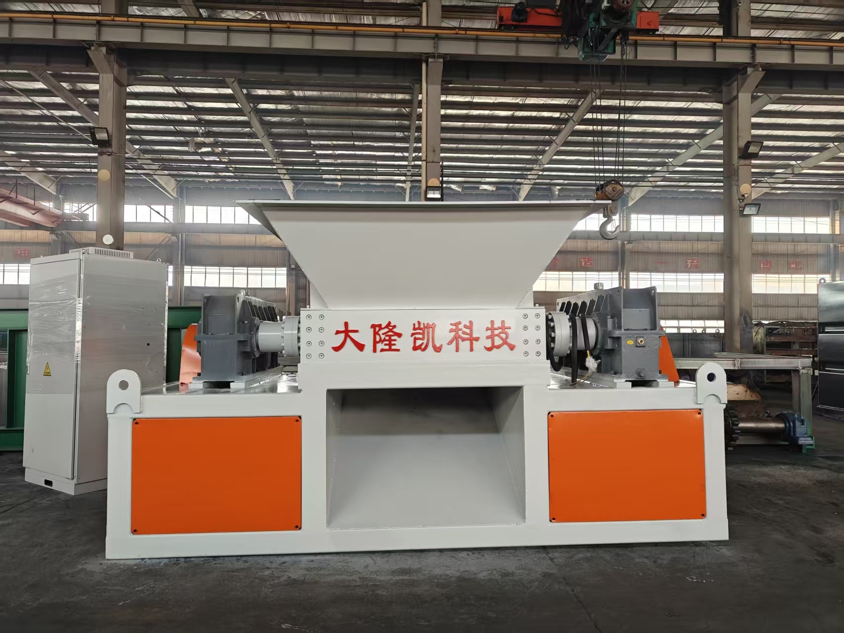 The DS double-shaft shredder features a robust construction with knife roller (spindle + blade), fixed knife, shredder box, box support, feed system, power system, and electrical control system. With low rotating speed and high torque, this machine is ideal for processing hard or large materials including waste paper, wood, garden waste, kitchen waste, medical waste, tires, plastic, household appliances, drums, and iron sheets.